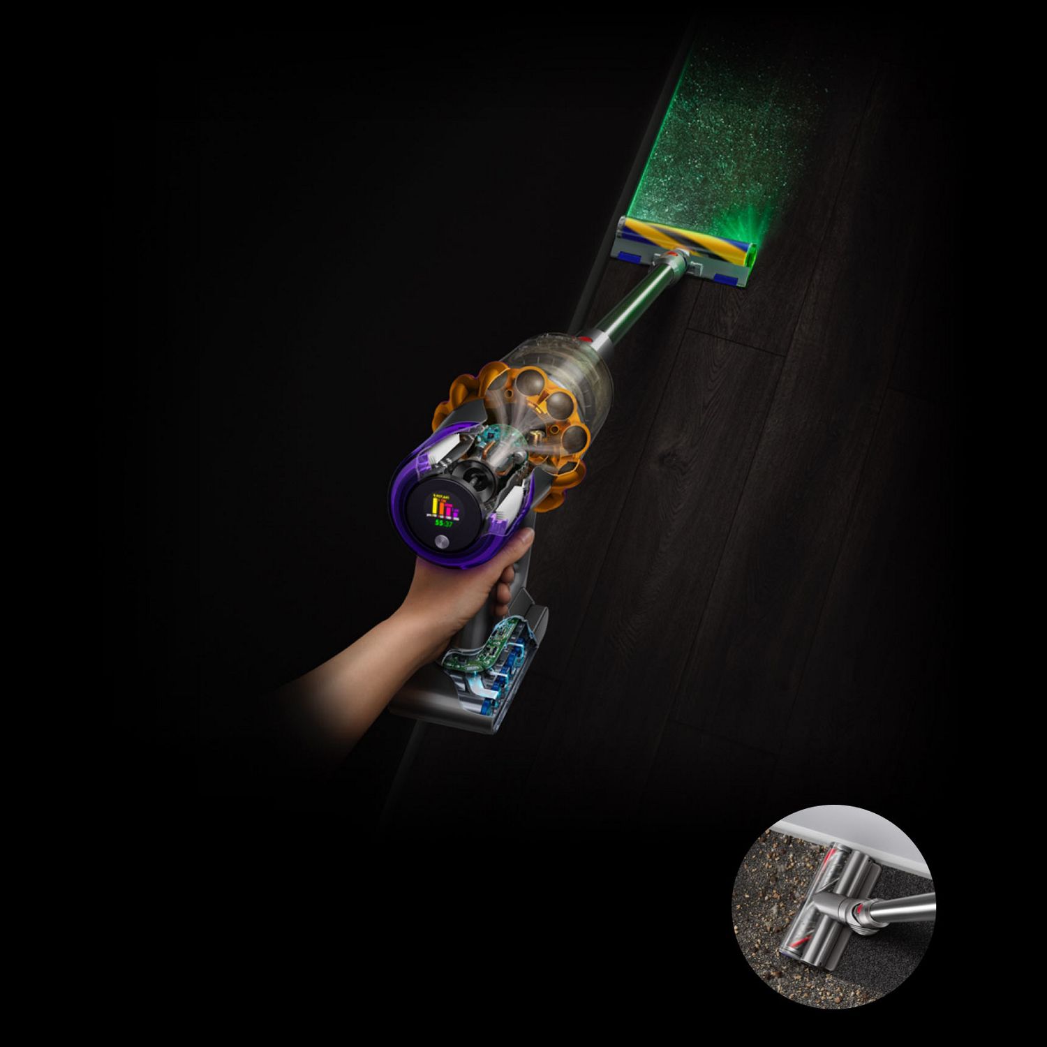 La spazzola Digital Motorbar™ pulisce in profondità pavimenti e tappeti, adattando la potenza d'aspirazione al tipo di superficie, grazie alla tecnologia DLS™. Inoltre, districa peli e capelli dal rullo della spazzola, evitando che questi gli si avvolgano intorno.